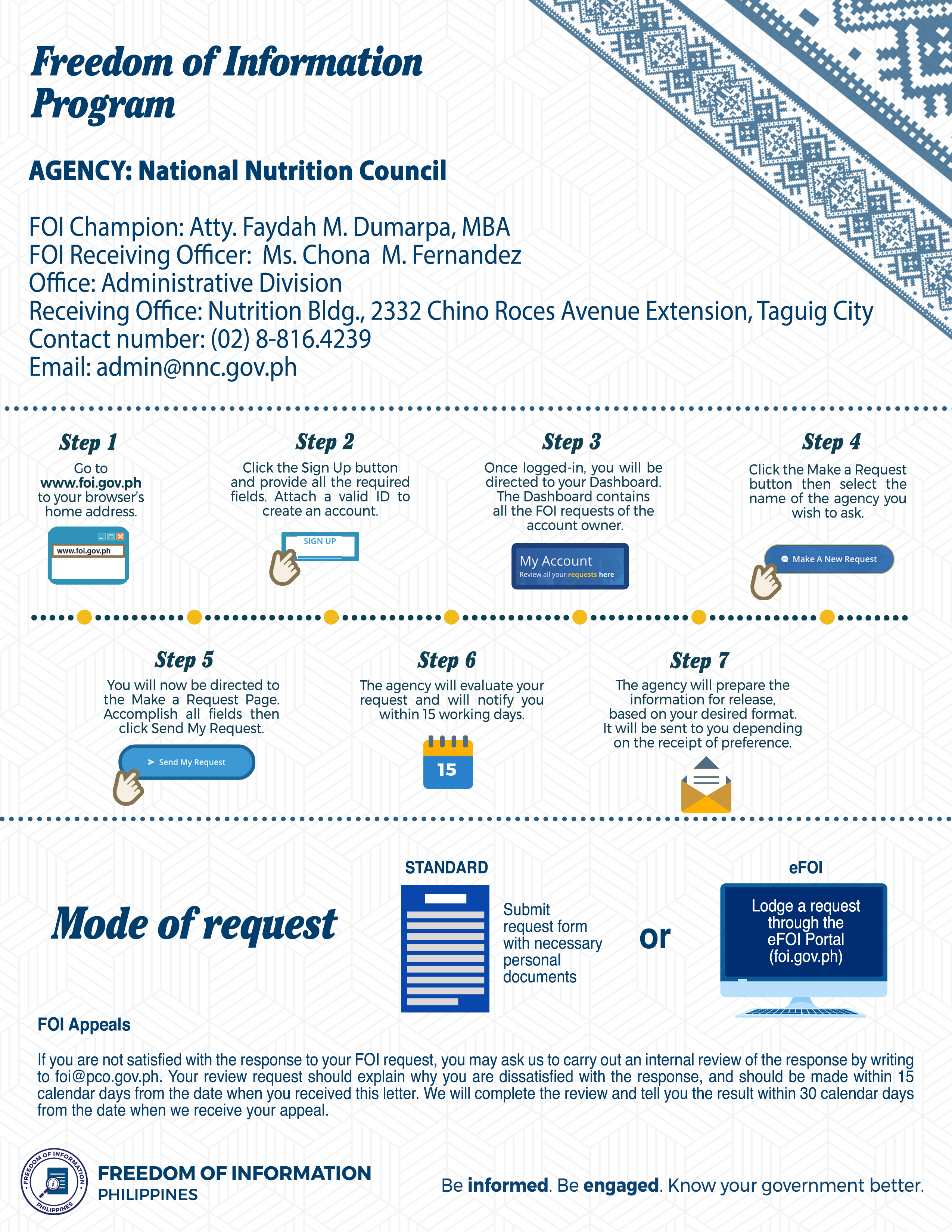 In compliance to National Budget Circular 542, issued by the Department of Budget and Management on August 29, 2012 and to Section 93 of the General Appropriations Act of FY 2012, the National Nutrition Council maintains a transparency seal on this website: